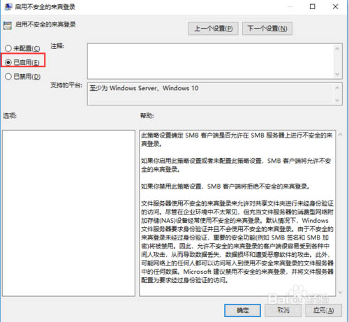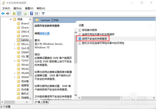 5、當然對于安全性要求不是太高的小伙伴也可以通過降低安全性來提升共享兼容能力。按Win+R,輸入gpedit.msc,打開“計算機配置-管理模板-網絡-Lanman工作站”,雙擊右側“啟用不安全的來賓登錄”,選擇“已啟用”并確認,重啟。