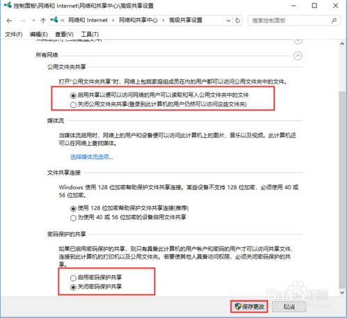 2、點擊“高級共享設置”,在“所有網絡”標簽下,勾選“公用文件夾共享”的第一個選項以及“密碼保護的共享”中的第一個選項,保存更改。