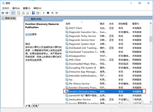 3、這樣設置后,其他電腦應該就能看到這臺共享電腦了。要是還不行的話,就需要進一步打開共享服務了。按Win+R后輸入services.msc。在右側找到“Function Discovery Resource Publication”并雙擊,點擊“啟動”。
